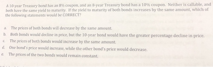 A 10-year Treasury bond is issued with a face value of ... 1. A. The coupon rate is $60 per year and is unaffected by changes in market interest rates. B. When market yields rise, bond prices fall to increase the yield to the new market levels.